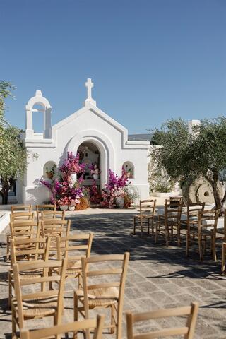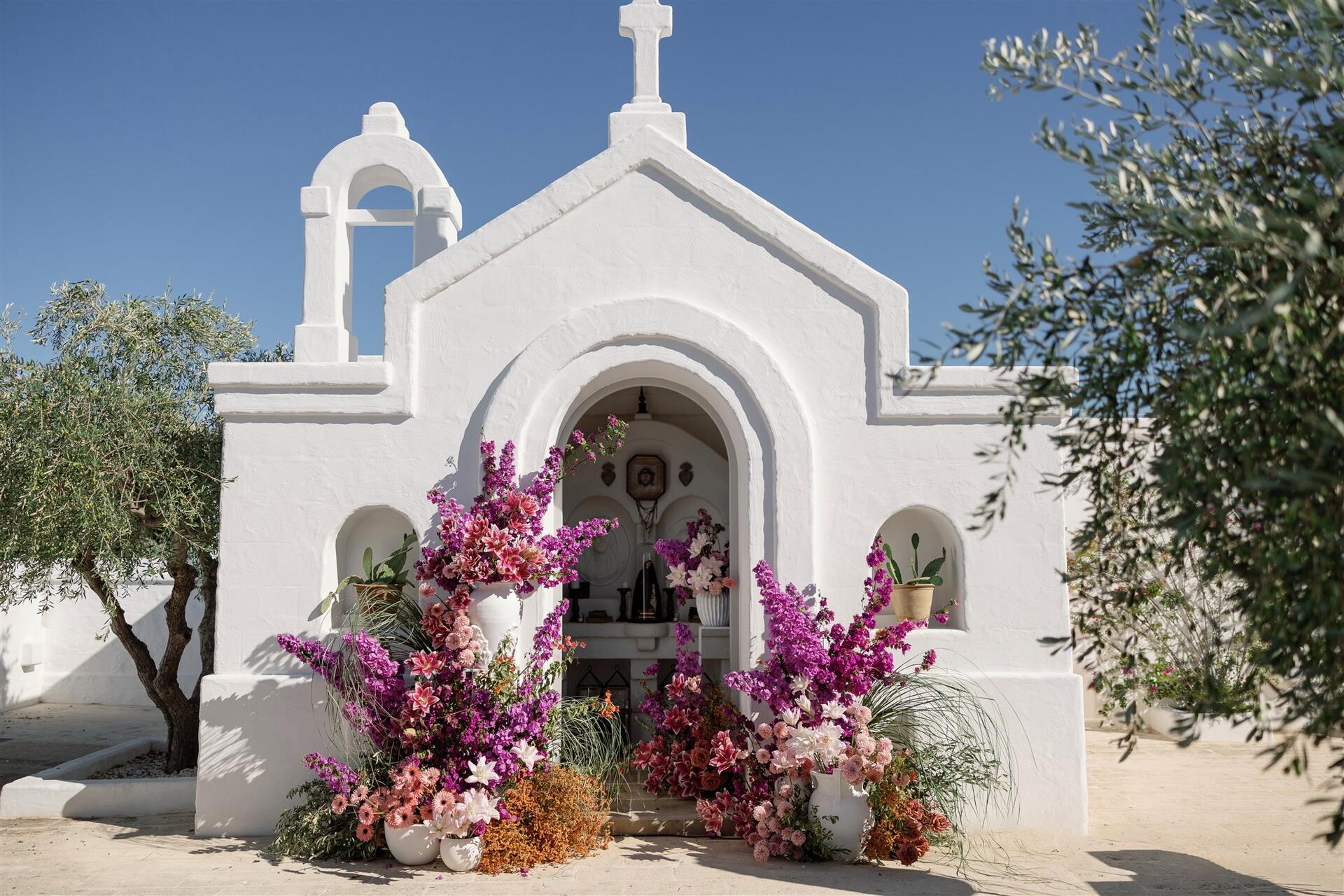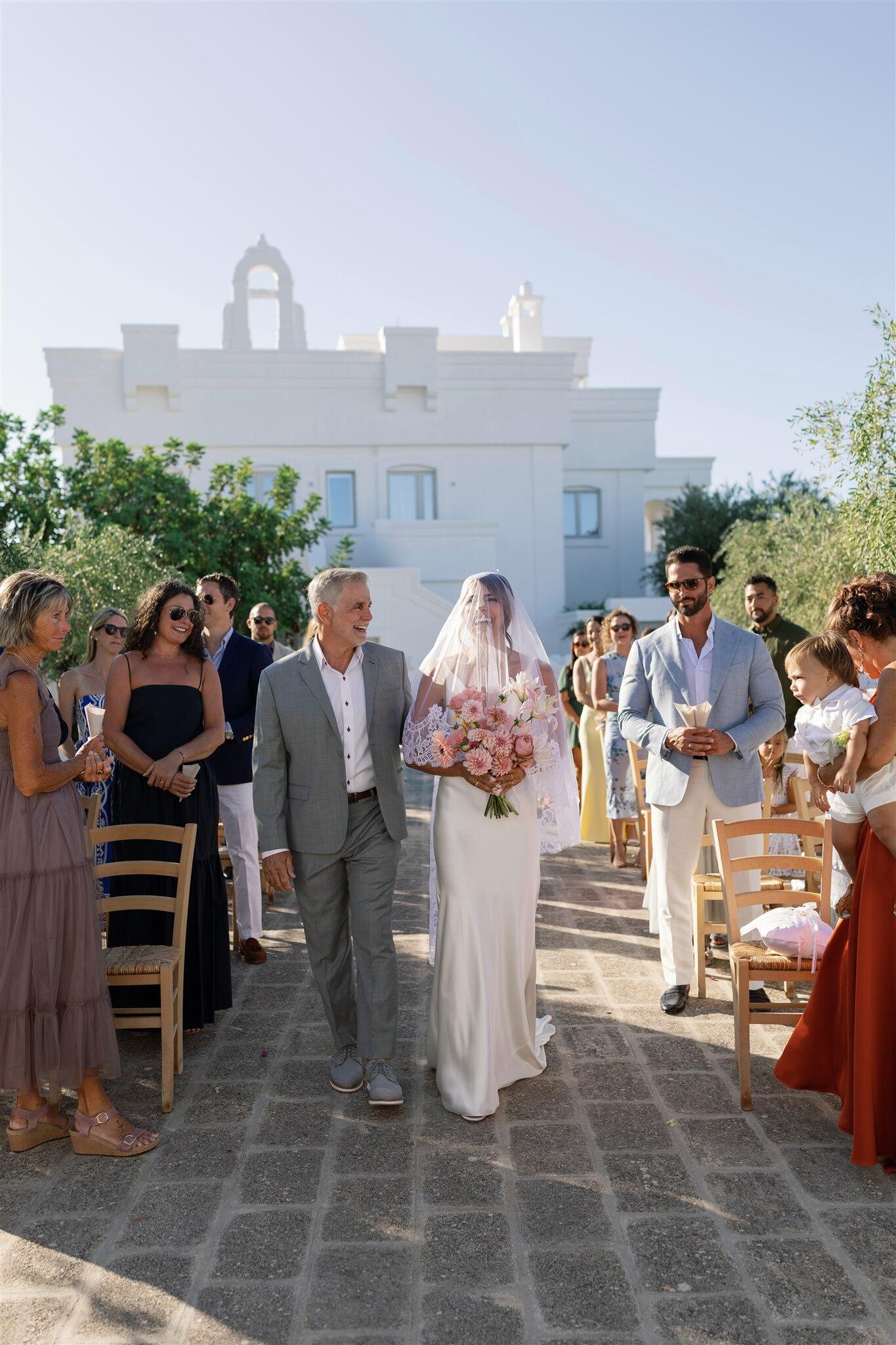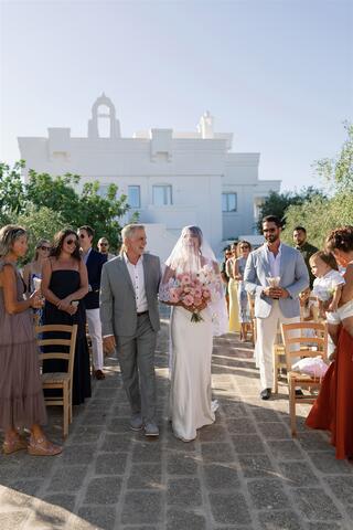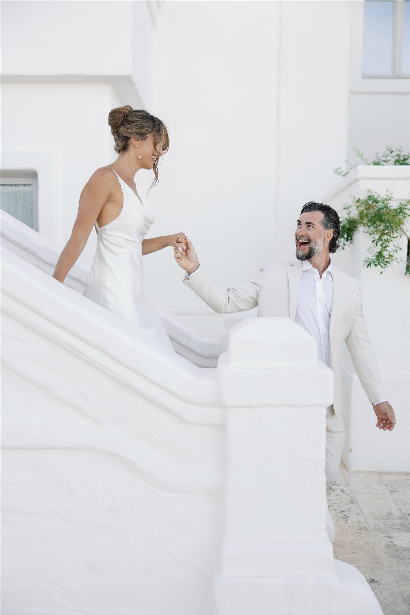 The wedding day unfolded under a clear Puglian sky, bright and luminous. White tones reflected the sunlight, creating an atmosphere that felt almost suspended in time. Guests moved through the borgo as if they were part of a shared home, not attendees at an event.