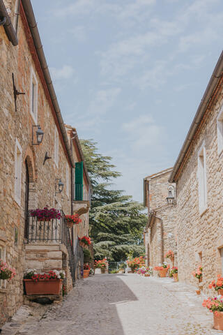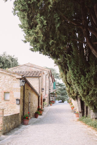On the soft, iconic hills of the inland region, rises the secret Borgo Laticastelli like a precious fairytale. With a glorious past guarding the land as a medieval fortress, today the place retains the same valor in welcoming young hearts and their vows within its ancient stone walls. 60 hectares of peaceful countryside embrace you in serenity, far from the outside noise yet close to everything that makes Tuscany the much-desired destination we all know. Many have described the unspoiled surroundings as a private fantasy world — cobbled alleys, panoramic terraces, and gardens overlooking the stunning Crete Senesi.