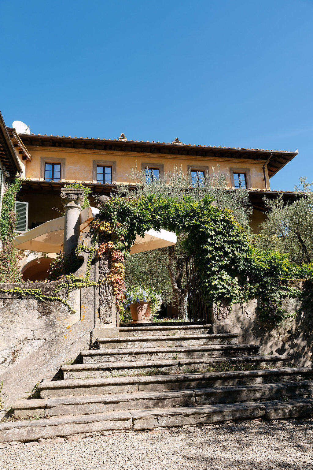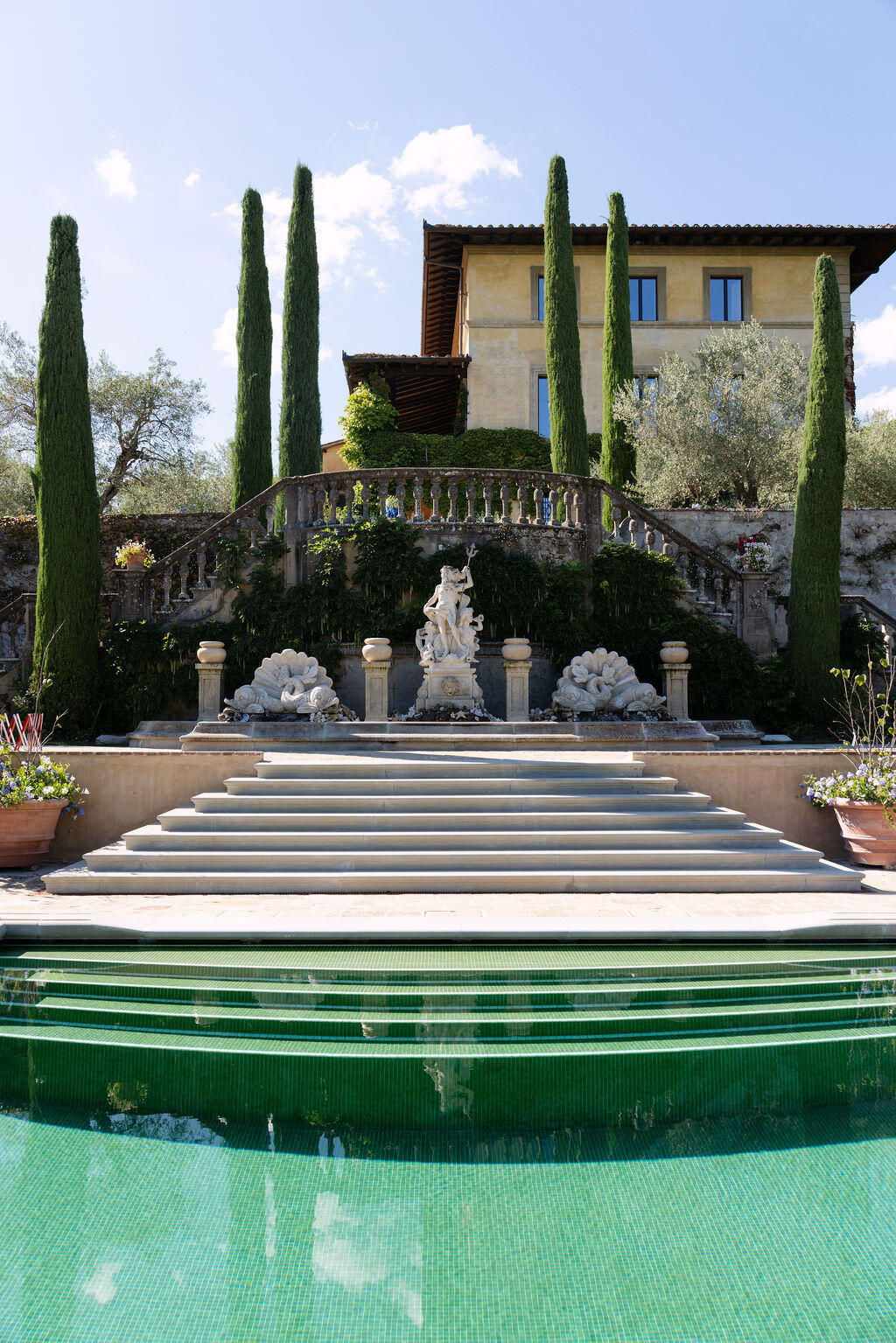 Il Palagio rises amidst a lush ocean of Mediterranean vegetation like a mythical dream suspended in time. Nestled in the rolling hills of Figline Val d’Arno, in the very heart of Tuscany, Tenuta Il Palagio is far more than a luxury villa: it is an estate with a soul, globally renowned as the private Tuscan residence of Sting and Trudy, and one of the most evocative wedding venues in Italy.